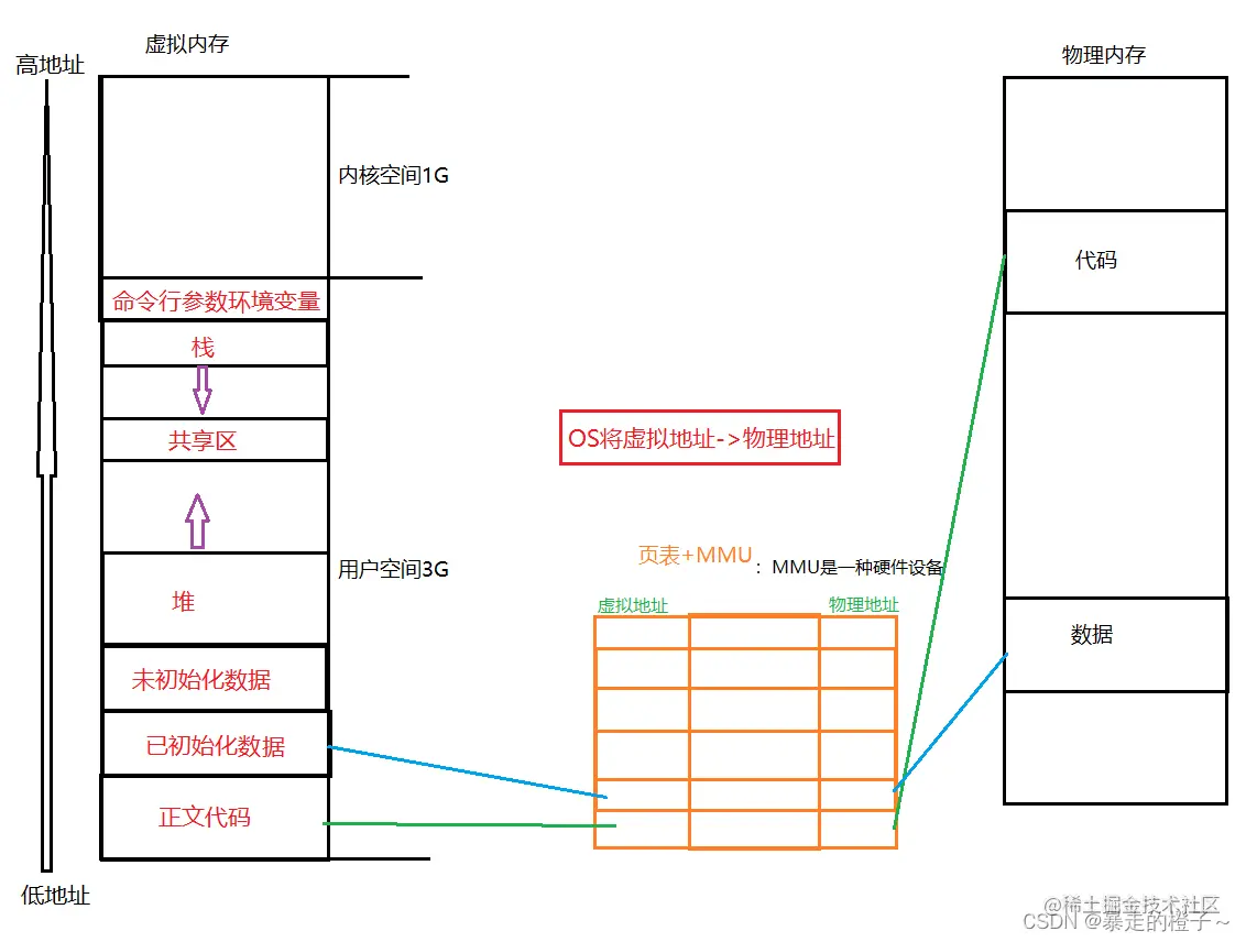 OS通过页表映射将虚拟地址转换为物理地址,进而可以运行代码和数据。页表实际上是一张哈希表,页表其实是非常复杂的,它还涉及到权限等。