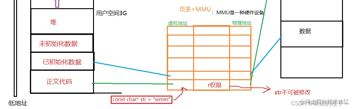 比如我们在语言层面上学习的常量字符串不能被修改,那到底是为什么呢?在语言层面上,是不可能解释清楚的,在这里我们就知道,常量字符串在常量区,当它通过页表映射时会有权限检查,它很显然只有r(只读)权限,当我们修改时,OS会立马检查出来并阻止修改!
