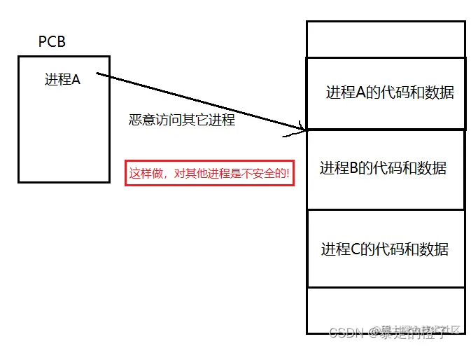 我们假设没有中间层场景:如果task_struct可以直接访问物理内存的代码和数据的话,这样中间是没有限制的,task_struct是能随意访问物理内存的。如果进程A的task_struct恶意访问其他进程的代码和数据,是不是就存在安全隐患?并且进程和进程之间就会被相互影响,就不能保证独立性了。