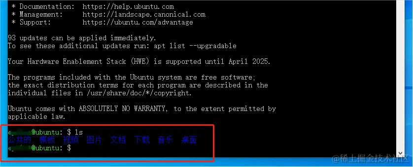 此时我们就能输入相应命令,远程操作Ubuntu系统。比如输入命令“ls”,就能看到Ubuntu系统下的文件夹情况。