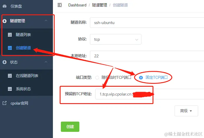 让我们回到Ubuntu系统的cpolar客户端,在Ubuntu系统的浏览器地址栏输入“localhost:9200”,就能进入cpolar 客户端的web-UI界面。在输入用户名和密码后,就能进入cpolar客户端的主界面。在主界面左侧,点选“隧道管理”项下的“创建隧道”,对远程连接的隧道出口进行设置。其中“隧道名称”仍选择方便识别的名称;“协议”选择为TCP;“本地地址”为端口22;“端口类型”选择固定TCP端口;“预留的TCP地址”则是在cpolar官网生成的地址(直接复制粘贴过来即可)。在完成这些设置后,点击下方绿色的“创建”按钮。