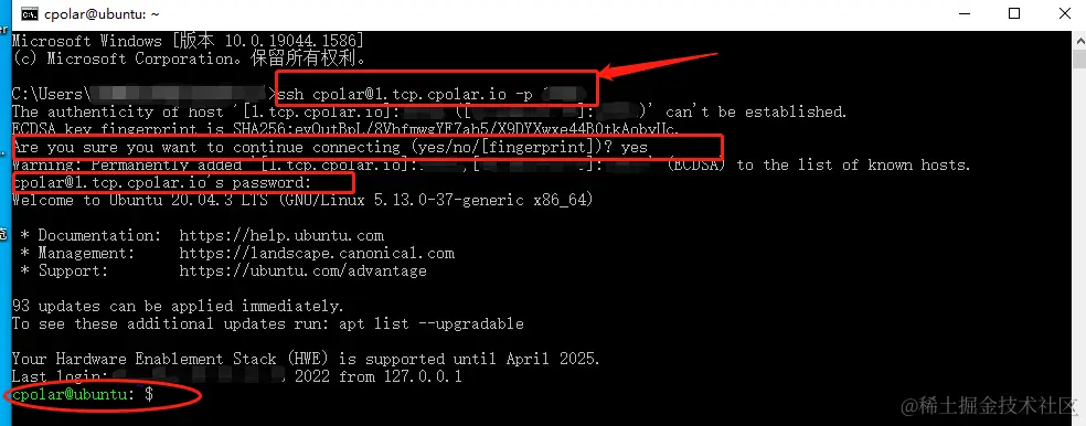 cpolar客户端的隧道出口创建完成后,点击左侧“状态”项下的“在线隧道列表”,就能看到固定TCP隧道的地址。这里我们记下这段地址,在windows操作系统的命令行界面,输入命令“ssh cpolar@1.tcp.cpolar.io -p XXXXX(cpolar生成的端口号)”。需要注意的是,在数字端口号之前,一定要添加“(空格)-p(空格)”,否则无法连接隧道;其次,在“ssh cpolar@”之后,要输入复制客户端生成的tcp地址。在windows命令行中输入正确命令后,windows会显示提示信息,是否确定远程连接Ubuntu系统,我们需要输入“yes”命令。接着在连接Ubuntu系统后,Ubuntu系统会要求输入系统密码(主要防止非授权的远程操作),输入Ubuntu系统的正确密码后,我们就能看到绿色字符的XXXXX(Ubuntu系统的名称)@Ubuntu,证明我们已经成功的从windows连接上远端的Ubuntu系统。