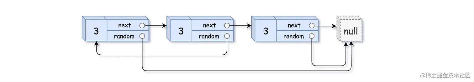 构造这个链表的 深拷贝。 深拷贝应该正好由 n 个 全新 节点组成,其中每个新节点的值都设为其对应的原节点的值。新节点的 next 指针和 random 指针也都应指向复制链表中的新节点,并使原链表和复制链表中的这些指针能够表示相同的链表状态。复制链表中的指针都不应指向原链表中的节点 。