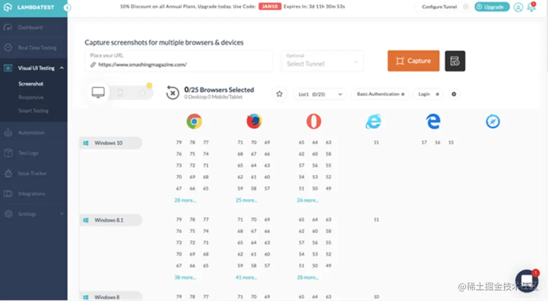 作为一款基于云的自动化跨浏览器测试平台,LambdaTest提供了2000多种浏览器和操作系统的组合,确保网页在所有主要浏览器、浏览器版本、操作系统、移动设备和分辨率上都是跨浏览器兼容和响应的。不仅是在Chrome上,这个插件还在Firefox、Safari、Internet Explorer、Edge、Android Chrome和iOS Safari上截图。这些屏幕截图将帮助快速查找网页的浏览器兼容性问题,是最为常见的跨浏览器测试工具之一。非免费,但它提供了一种终身免费的选项。
