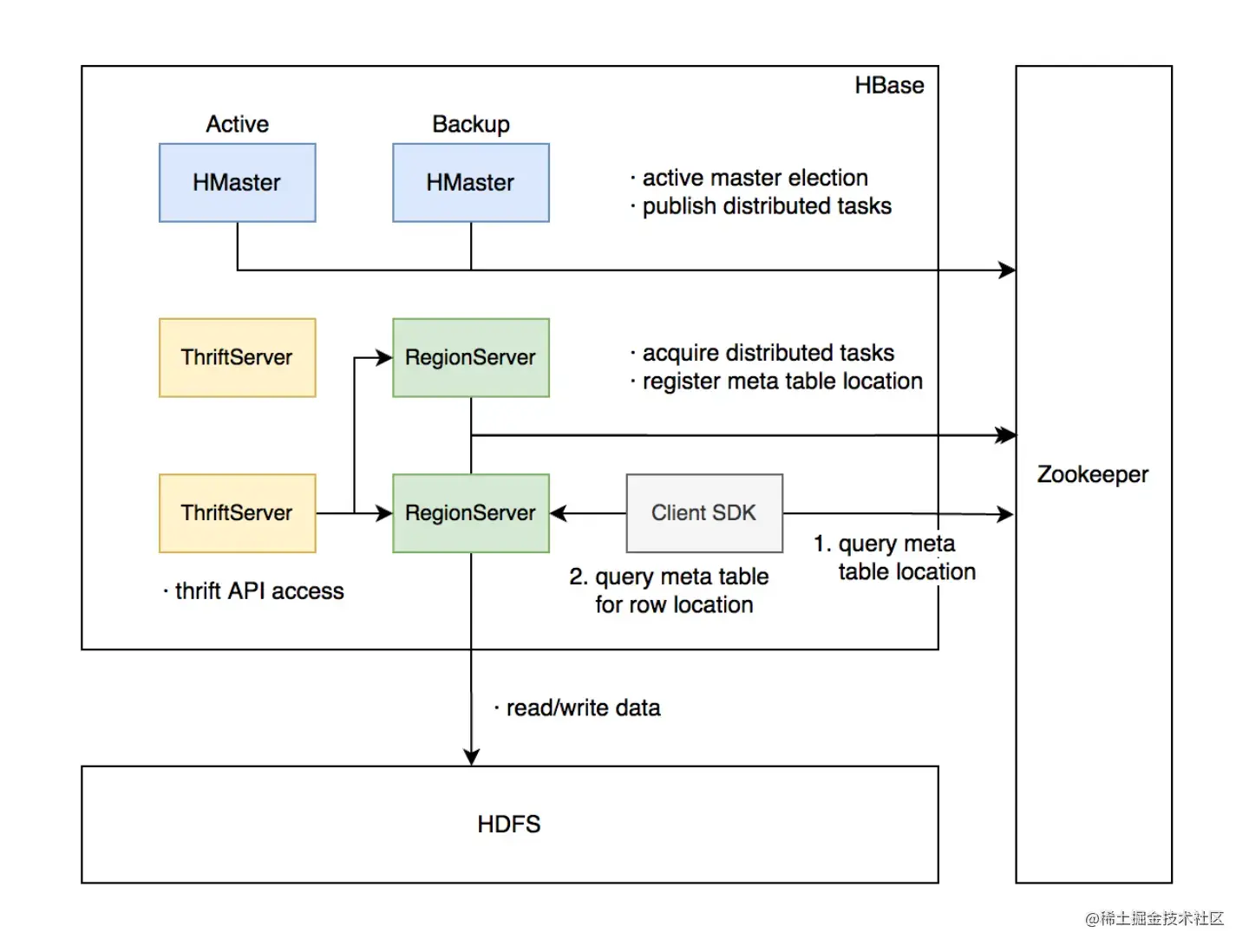 RocksDB 是单机存储引擎,那么现在都说云原生,HBase 比 RocksDB 就更「云」一些,SST 直接存储于 HDFS 上,Meta 信息 RocksDB 自己管理维护于 Manifest 文件,HBase 放置于 ZK。二者在理论存储模型上都是 LSMT。