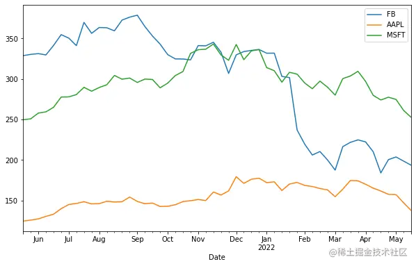 在今天的文章中,我们将研究 Facebook、微软和苹果股票的每周收盘价。以下代码导入可视化所需的必要库和数据集,然后在输出中显示 DataFrame 的内容。 %matplotlib 内联魔法命令也被添加到代码中,以确保绘制的数字正确显示在笔记本单元格中: