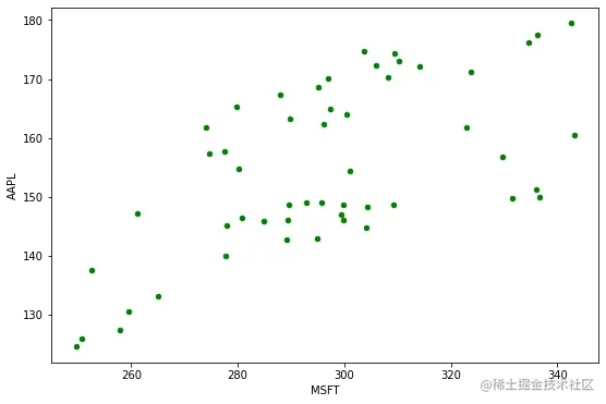 正如我们在上图中看到的,散点图显示了微软和苹果股价之间的关系。