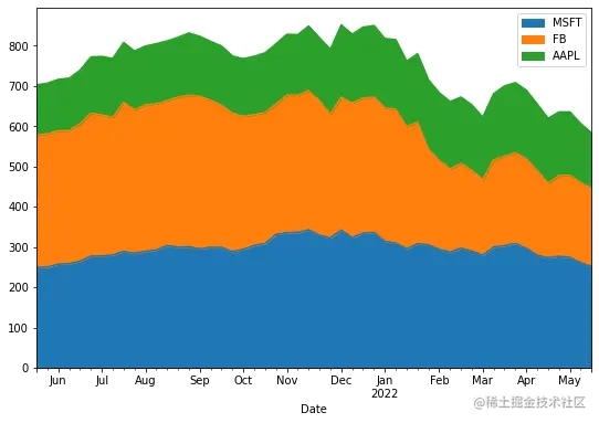 面积图是折线图的扩展,它用颜色填充折线图和 x 轴之间的区域。如果在同一个图中显示了多个面积图,则不同的颜色可以区分不同的面积图:
