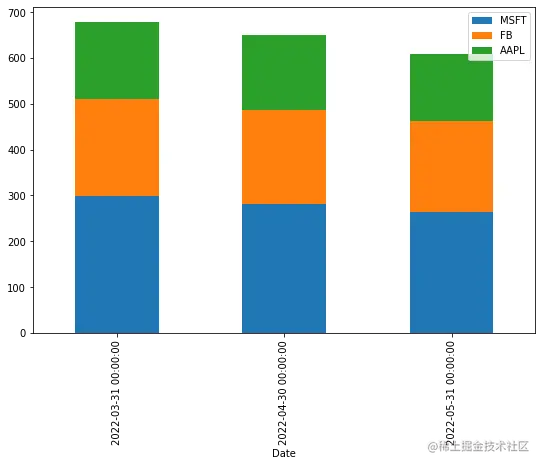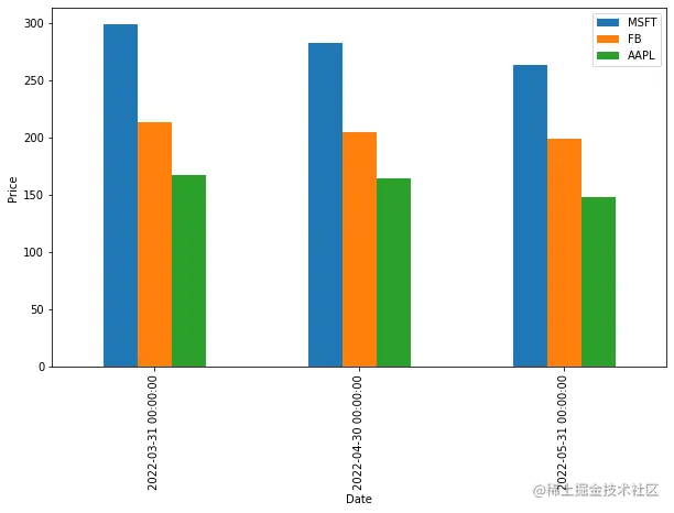 在下面的示例中,我们将根据每月平均股价创建一个条形图,来比较每个公司在特定月份与其他公司的平均股价。首先,我们需要按月末重新采样数据,然后使用 mean() 方法计算每个月的平均股价。我们还选择了最近三个月的数据,如下所示: