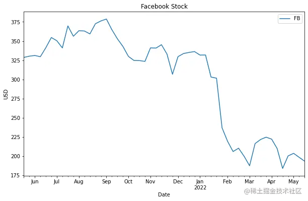 df.plot(y='FB', figsize=(10,6), title='Facebook Stock', ylabel='USD')