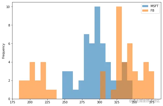 df[['MSFT', 'FB']].plot(kind='hist', bins=25, alpha=0.6, stacked=True, figsize=(9,6))