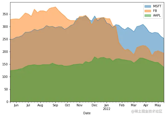 Pandas plot() 方法默认创建堆积面积图,通过将 False 分配给堆叠参数来取消堆叠面积图是一项常见任务: