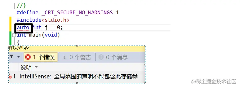 ⒊代码示例演示 ⇨ 举例-【C语言】在修饰当中仅仅使用 auto 变量修饰局部变量是默认为整形,但是 auto 在全局变量的时候会出现编译错误。