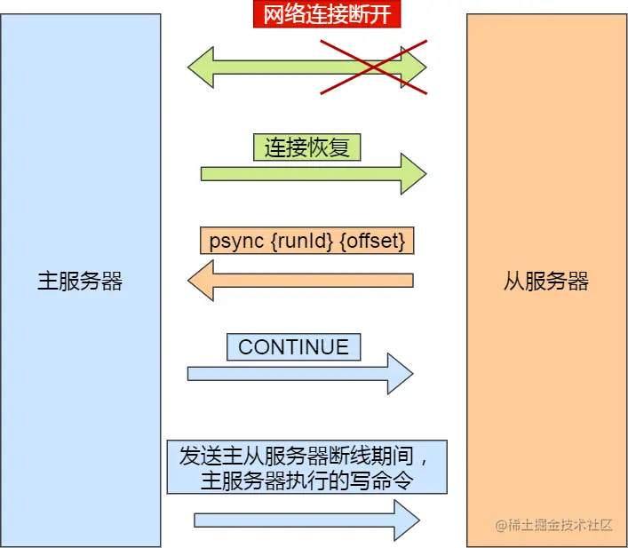 - 然后主服务将断连期间的写命令发送给从服务器,执行。