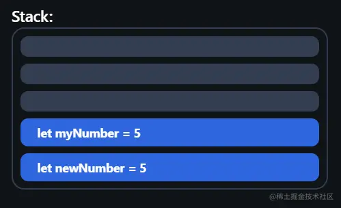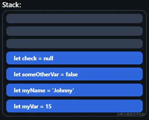 Javascript在堆栈中存储原始类型,如number、string、boolean、null undefined bigint和。在代码中定义变量时,它们会被添加到堆栈的顶部: