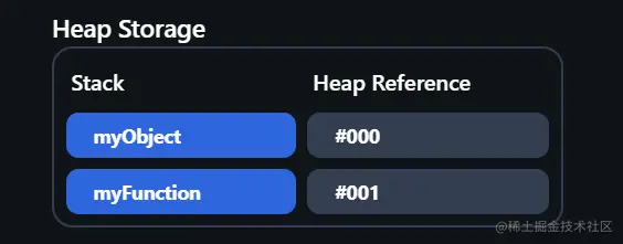 如下图所示,为栈中的每一个myObject和myFunction分别做了一个新的引用#000#001,分别带有引用和。该引用是内存中存储它们的位置。