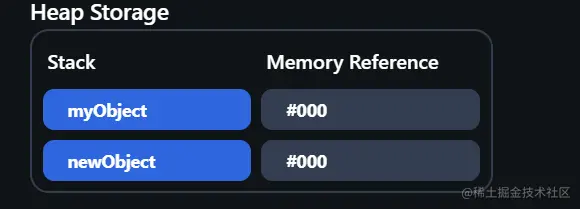 与堆栈相比,堆存储的主要区别在于,如果我们再次引用一个对象,则引用保持不变。这意味着如果我们尝试利用myObject创建一个新的对象,它将保持相同的引用: