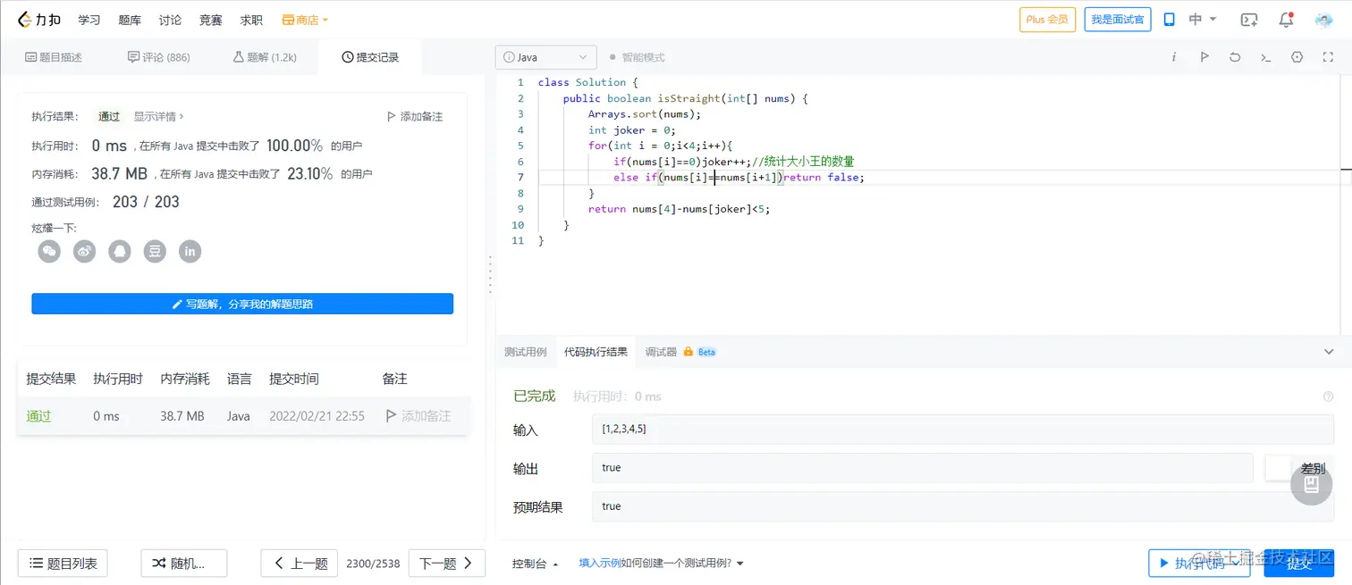 题目描述 :从若干副扑克牌中随机抽 5 张牌,判断是不是一个顺子,即这5张牌是不是连续的。2~10为数字本身,A为1,J为11,Q为12,K为13,而大、小王为 0 ,可以看成任意数字。A 不能视为 14。