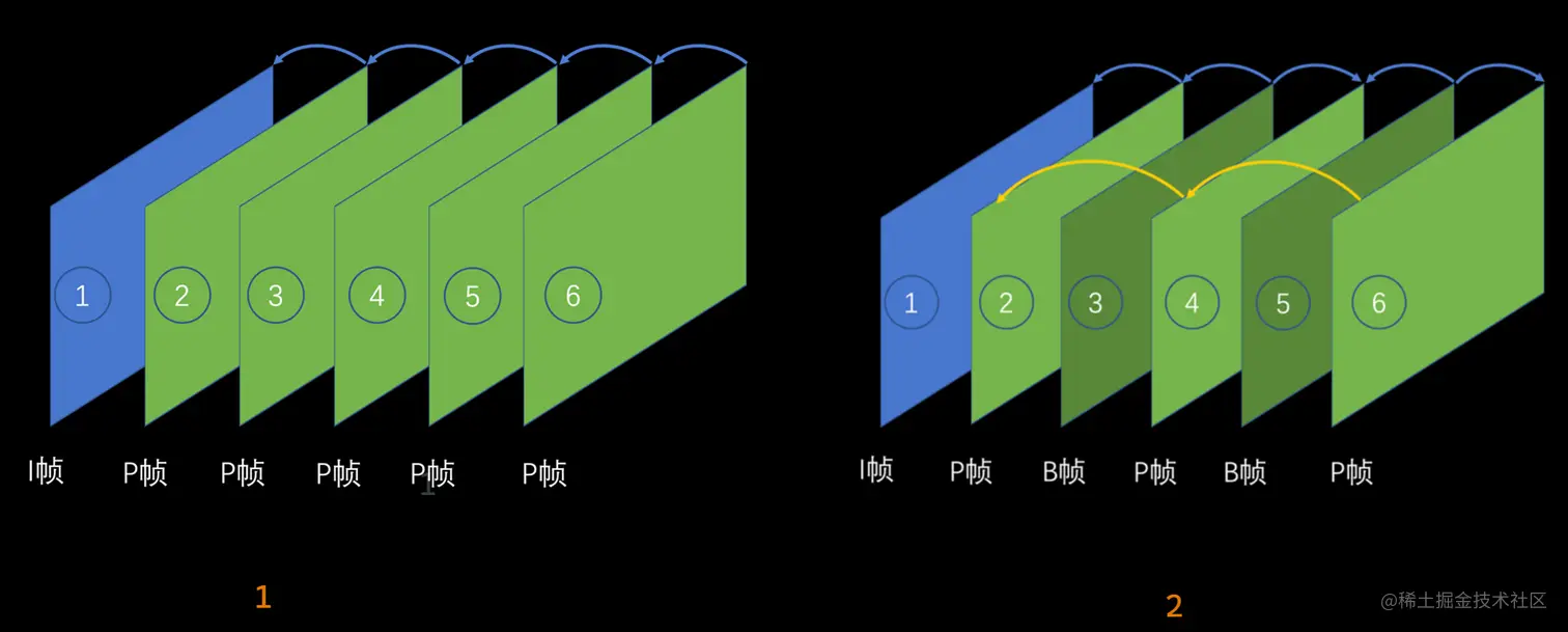 第二幅图先读取I帧,P帧再参考I帧进行编码,在读取第4帧P帧,再读取B帧参考2、4帧的P帧,依次类推,顺序是1,2,4,3,6,5。