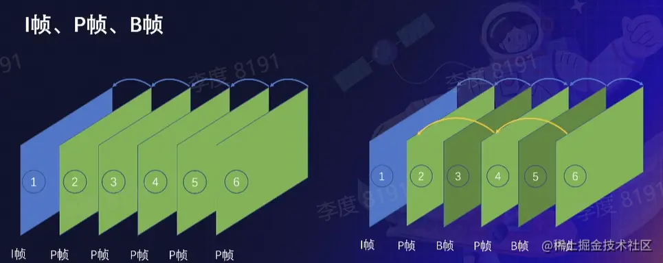 P帧:前向预测编码在帧(predictive-frame),通过将图像序列中前面已编码帧的时间冗余信息去充分去除压缩传输数据量的编码图像,也成为预测帧。