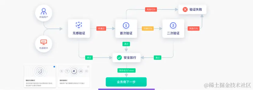 一般来说,正常用户在100毫秒内可无感通过,普通用户只需完成首次认证,5秒内也可无感通过,疑似风险用户则需进行二次验证,风险用户则会被直接拒绝。