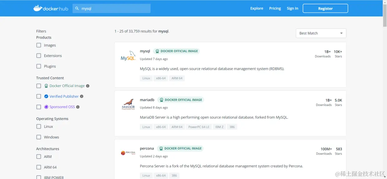 比如想要获取 mysql 镜像,只需要一行命令就可以获取了