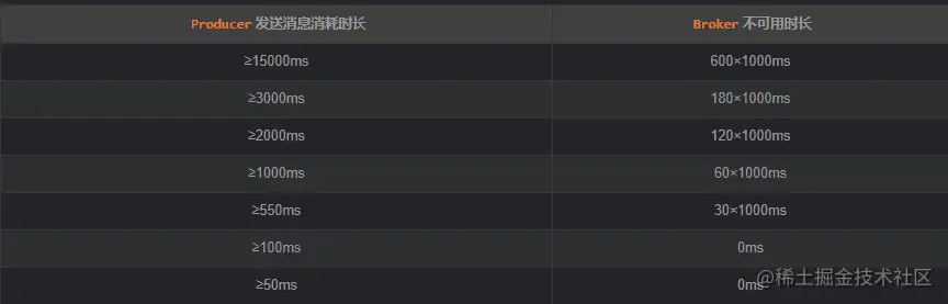 updateFaultItem更新Broker对应的延迟,如果Producer发送消息时间过长,则认为一段时间N内不可用,N的取值与Producer发送消息持续时长的关系如下表:(其实就是上面源码中的latencyMax和notAvailableDuration数组)