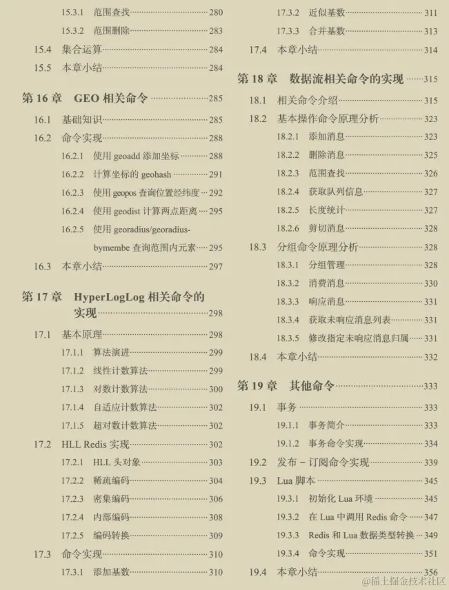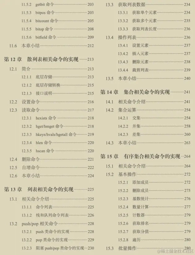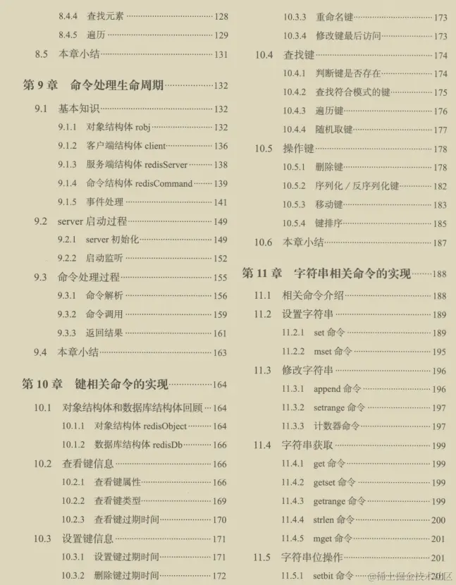 第二篇:第9章讲解了Redis的生命周期,命令执行的过程,需要重点阅读;第10~19章,分别讲解了键、字符串、散列表、链表、集合、有序集合、GEO、HyperLog和数据流相关命令的实现。