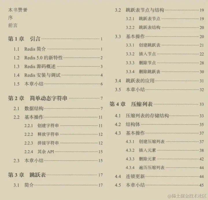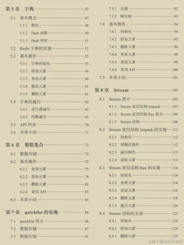 第一篇:第1章简单介绍了Redis,以及Redis 的编译安装和研读的方式;第2~8章重点讲解了SDS、跳跃表、压缩列表、字典、整数集合、quicklist和Stream数据结构的实现。