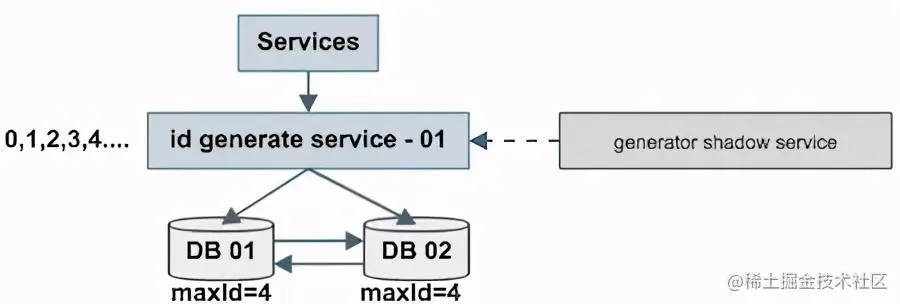 如上图,对外提供的服务是主服务,有一个影子服务时刻处于备用状态,当主服务挂了的时候影子服务顶上。这个切换的过程对调用方是透明的,可以自动完成,常用的技术是 vip+keepalived。另外,id generate service 也可以进行水平扩展,以解决上述缺点,但会引发一致性问题。