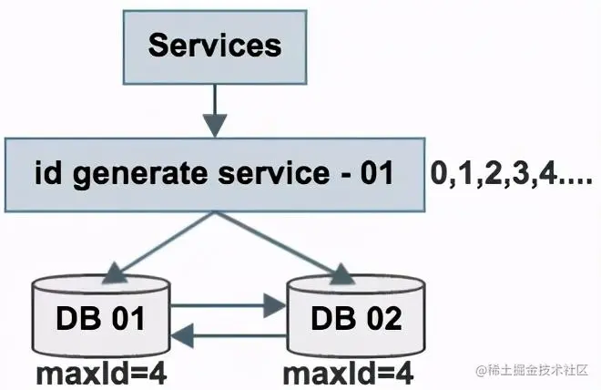 如上图所述,数据库使用双master保证可用性,数据库中只存储当前ID的最大值,例如4。