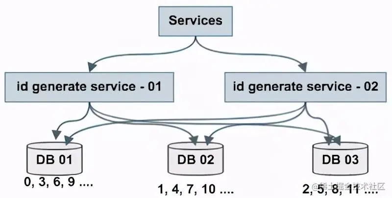 如上图所述,由1个写库变成3个写库,每个写库设置不同的 auto_increment 初始值,以及相同的增长步长,以保证每个数据库生成的ID是不同的(上图中DB 01生成0,3,6,9…,DB 02生成1,4,7,10,DB 03生成2,5,8,11…)