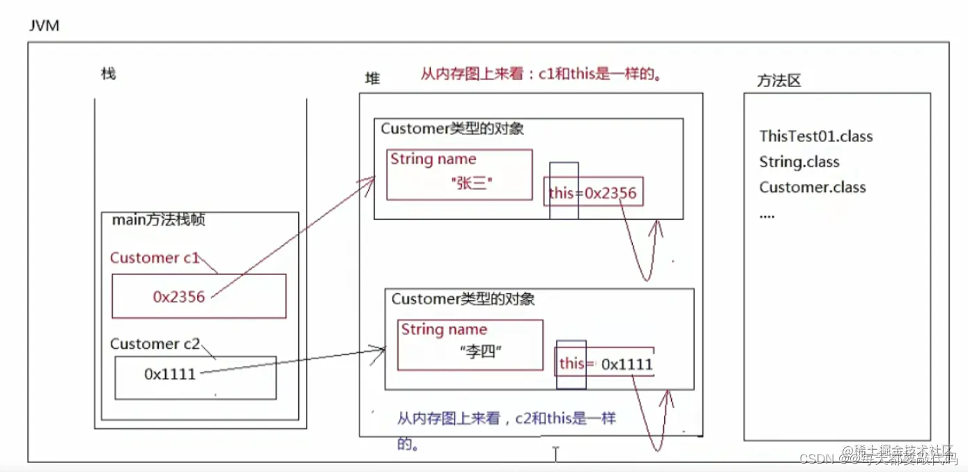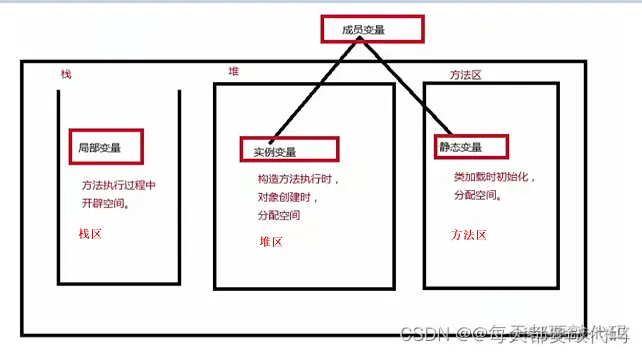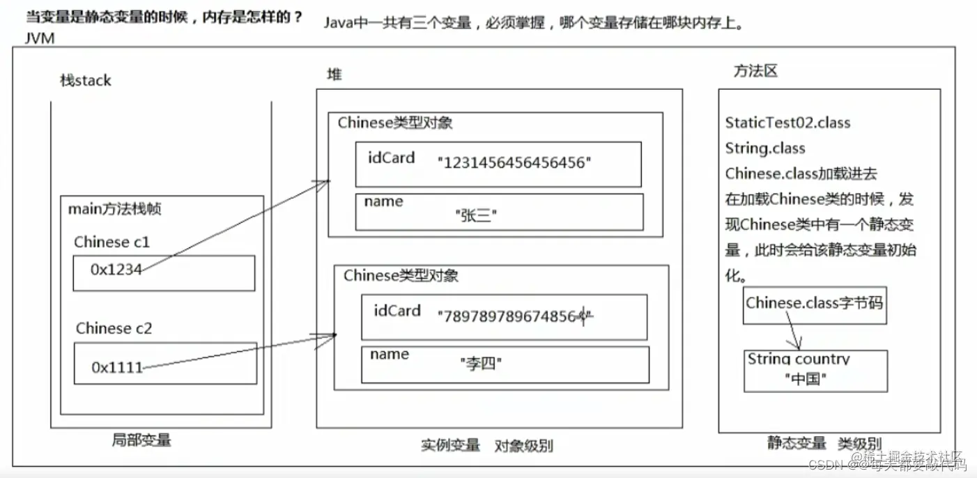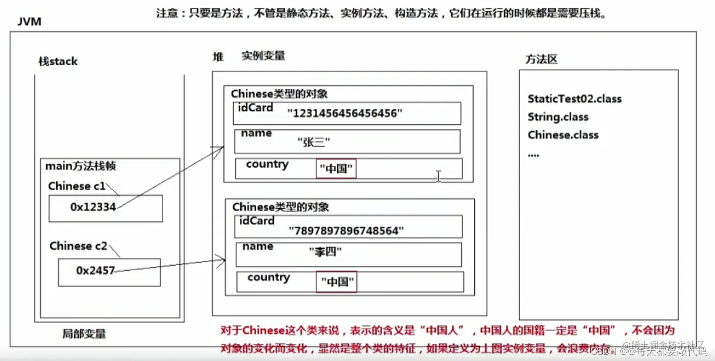 (2)实例变量存储在堆区。⭐️记住一句话:静态变量在方法区,在类加载时初始化!