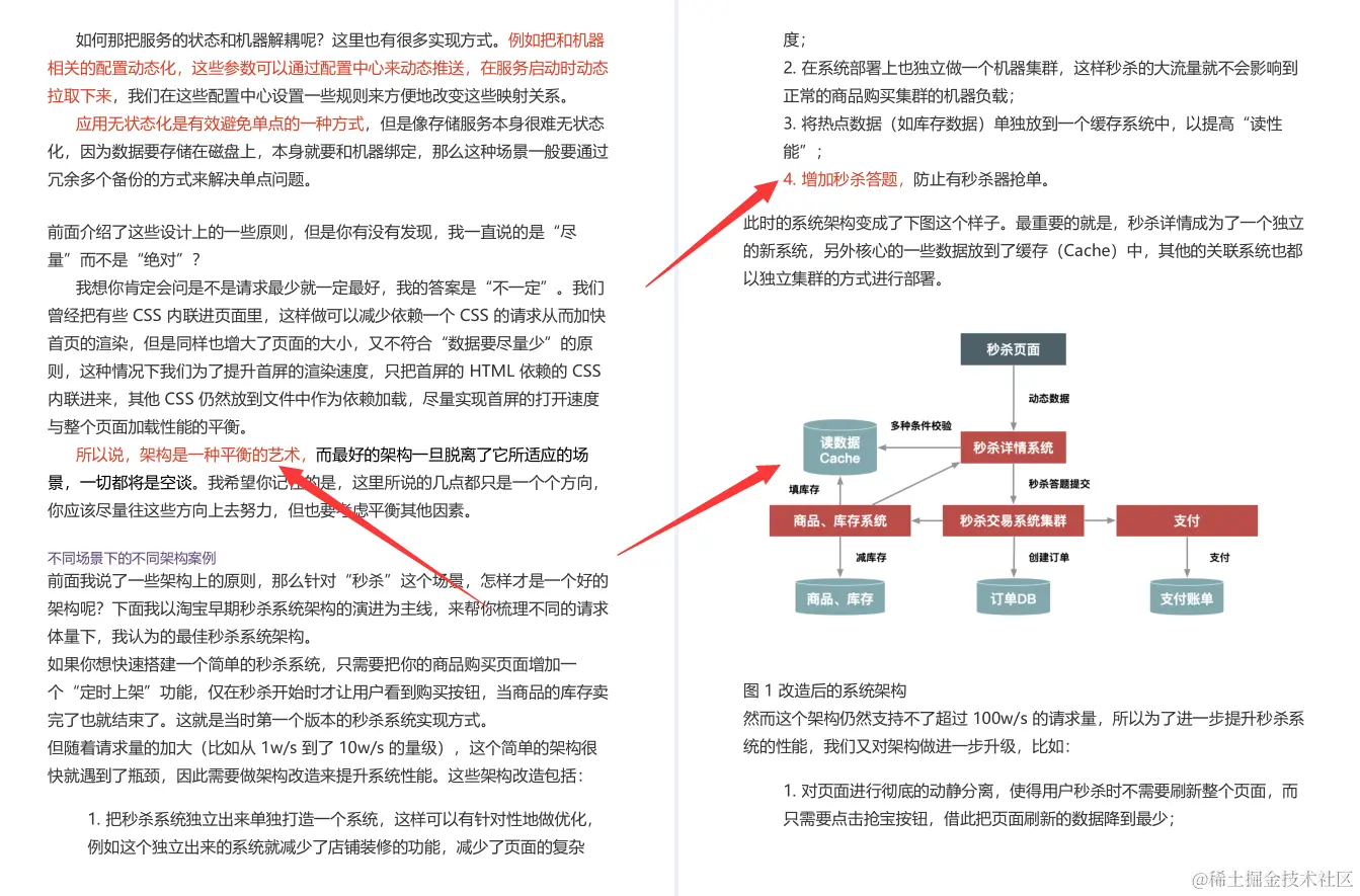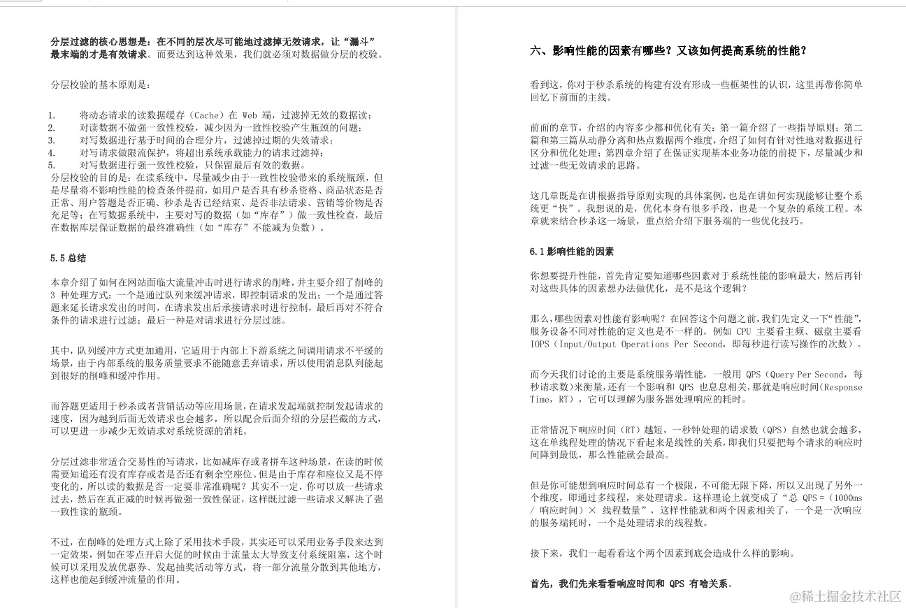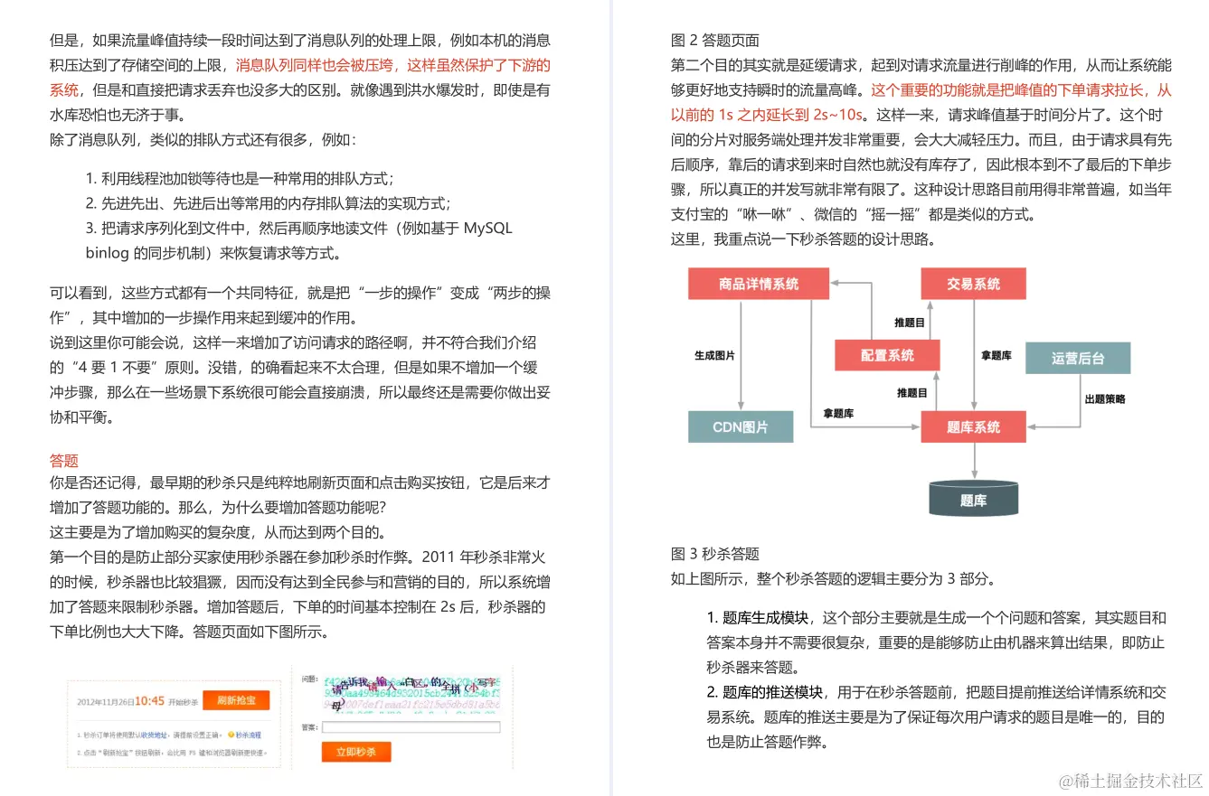 - . 高性能。秒杀涉及大量的并发读和并发写,因此支持高并发访问这点非常关键。本专栏将从设计数据的动静分离方案、热点的发现与隔离、请求的削峰与分层过滤、服务端的极致优化这4个方面重点介绍。