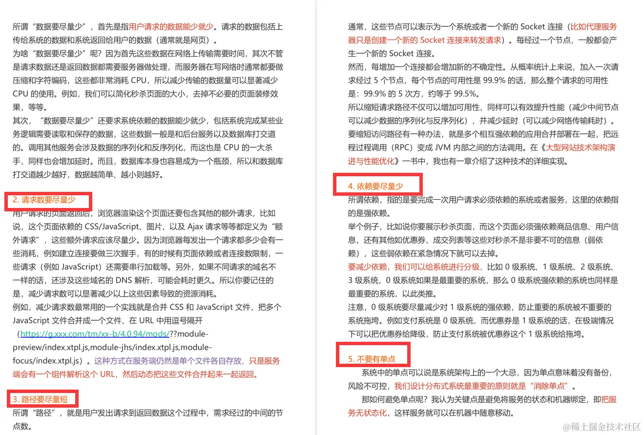而从一个架构师的角度来看,要想打造并维护一个超大流量并发读写、高性能、高可用的系统,在整个用户请求路径上从浏览器到服务端我们要遵循几个原则,就是要保证用户请求的数据尽量少、请求数尽量少、路径尽量短、依赖尽量少,并且不要有单点。这些关键点我会在后面的文章里重点讲解。