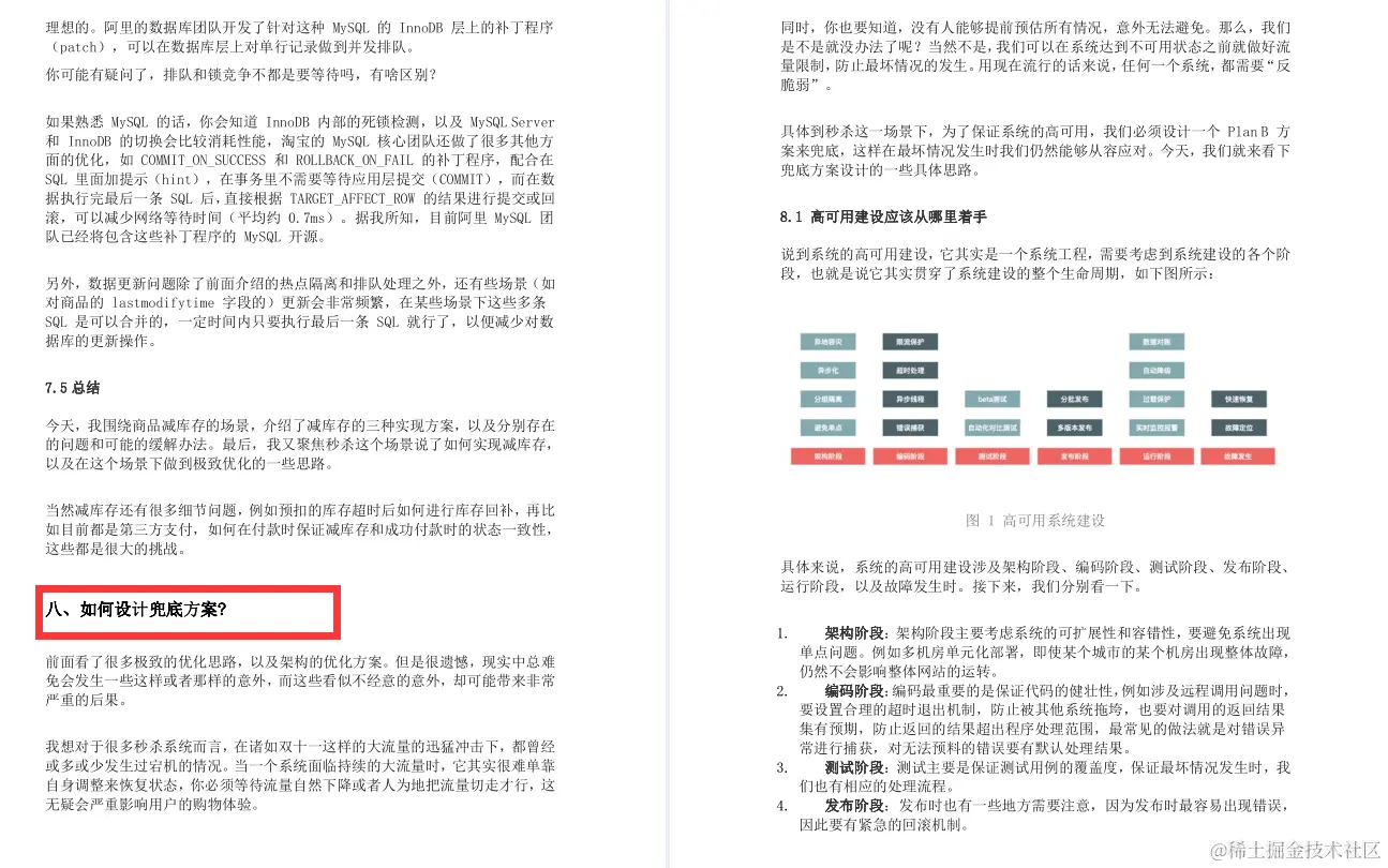 - .高可用。虽然我介绍了很多极致的优化思路,但现实中总难免出现一些我们考虑不到的情况,所以要保证系统的高可用和正确性,我们还要设计一个 PlanB来兜底,以便在最坏情况发生时仍然能够从容应对。专栏的