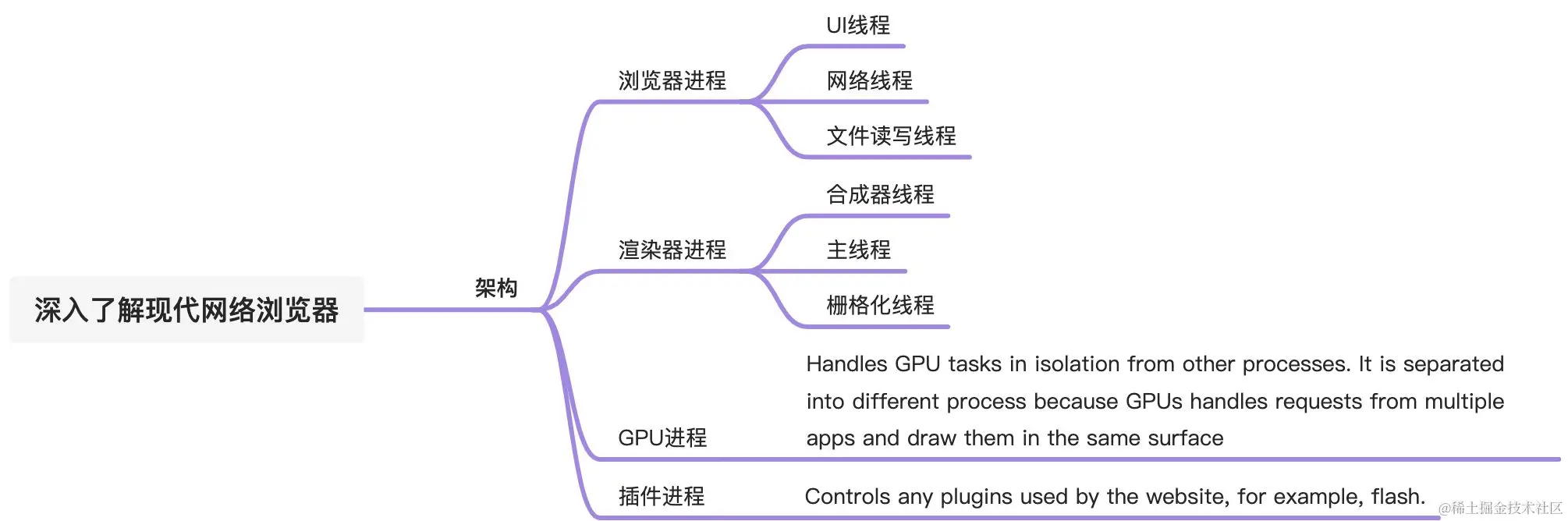 - Browser Process: 控制应用程序的“chrome”部分,包括地址栏、书签、后退和前进按钮。还处理网络浏览器中不可见的部分,例如网络请求和文件访问