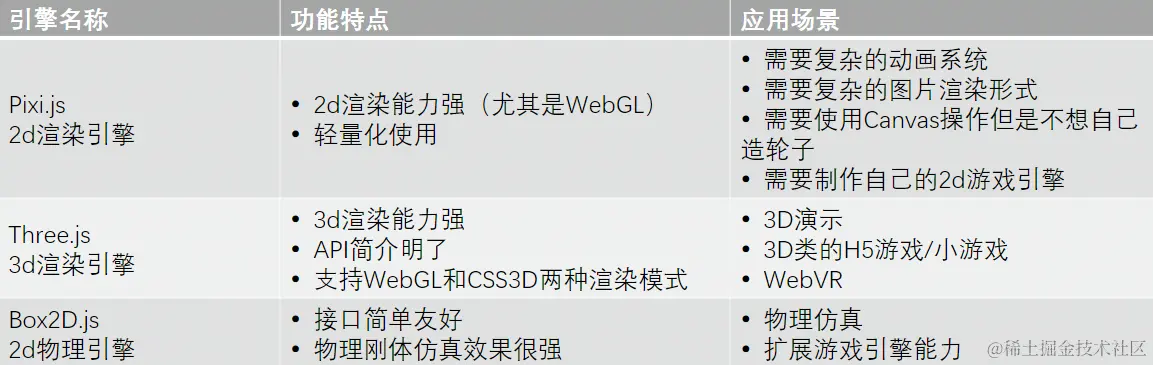 功能引擎是专注某个方向能力的引擎,其特点是体积小、功能完善。特别是Pixi.js和Three.js这两个渲染引擎,通常被误以为是一个完整的游戏引擎,但它们是专注渲染能力的渲染引擎。