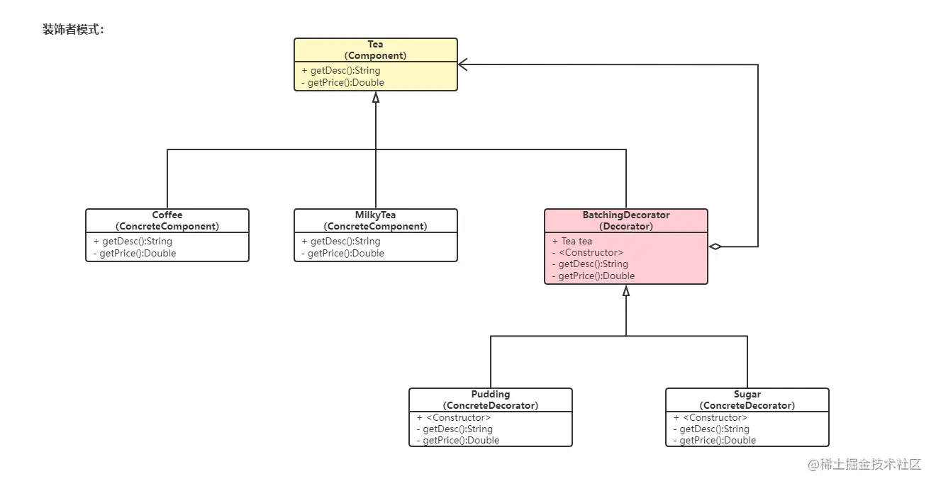 Concrete Decorator)角色:负责给构件对象添加上附加的责任。此处我们有一个诉求:使用装饰者模式,使不同饮料主体搭配不同配料动态输出相应价格及信息。