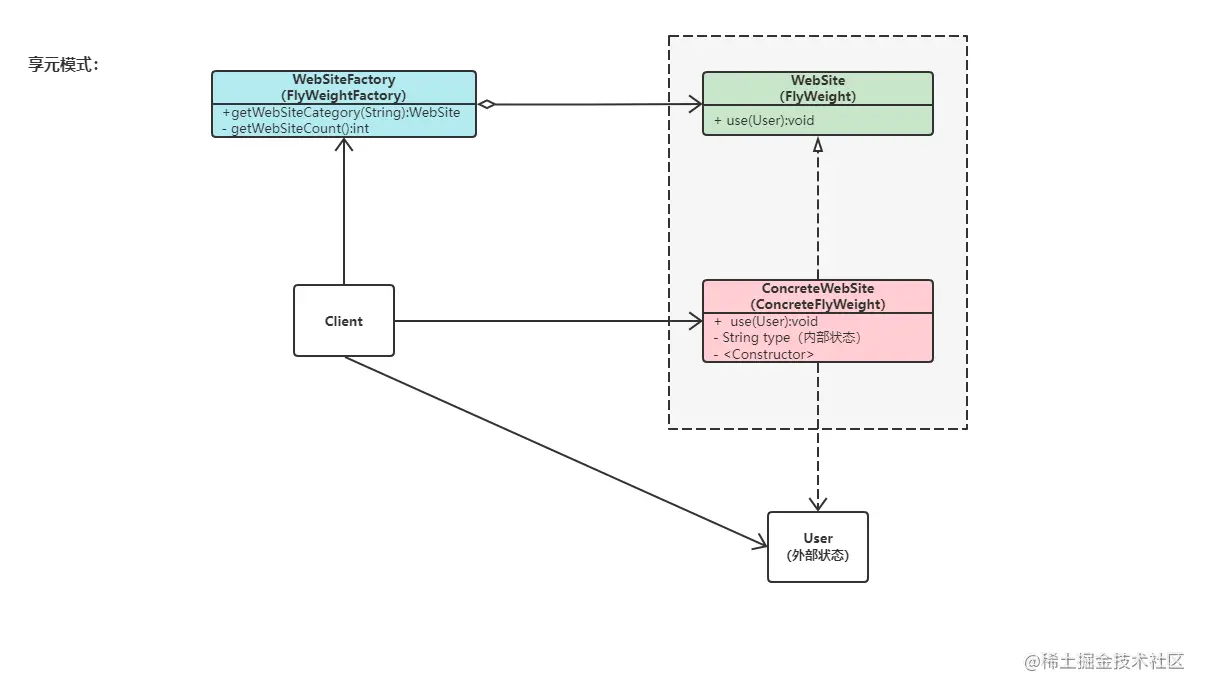 - 内部状态:存储在享元对象内部且不会随环境改变而改变。