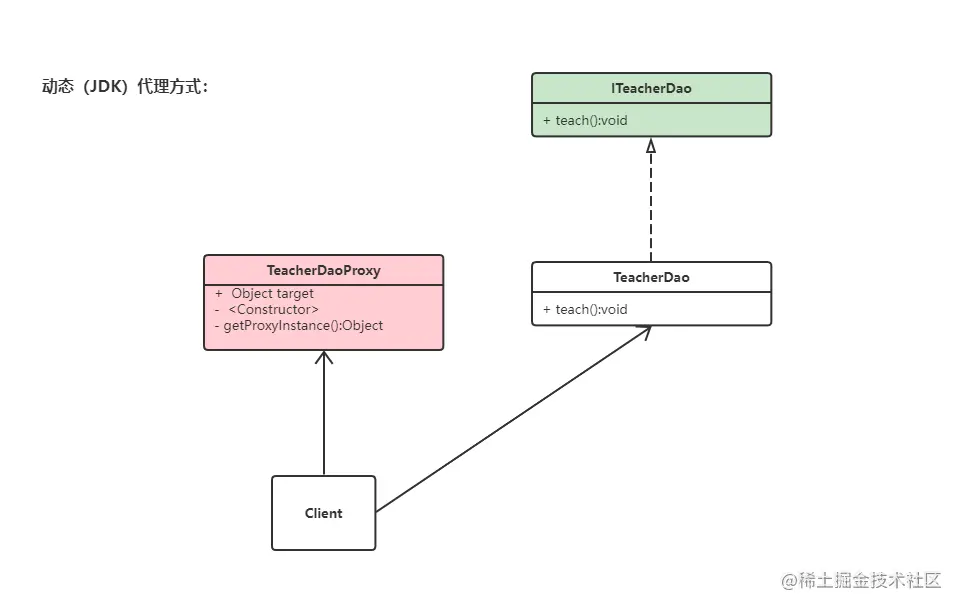 * TeacherDaoProxy类使用JDK动态代理,无需实现接口。