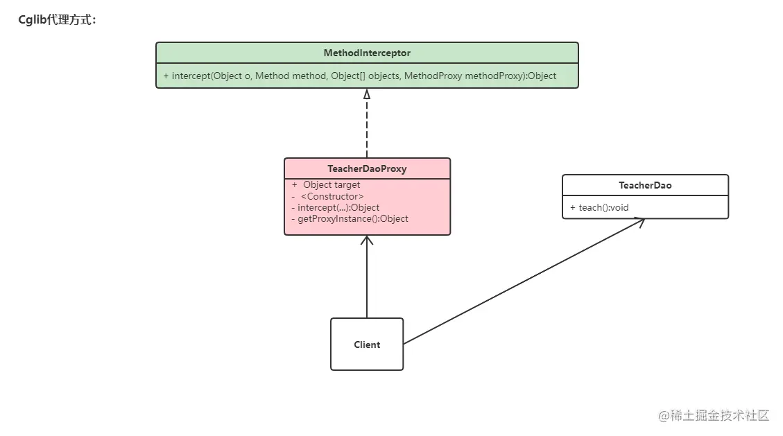 * TeacherDaoProxy实现MethodInterceptor接口。