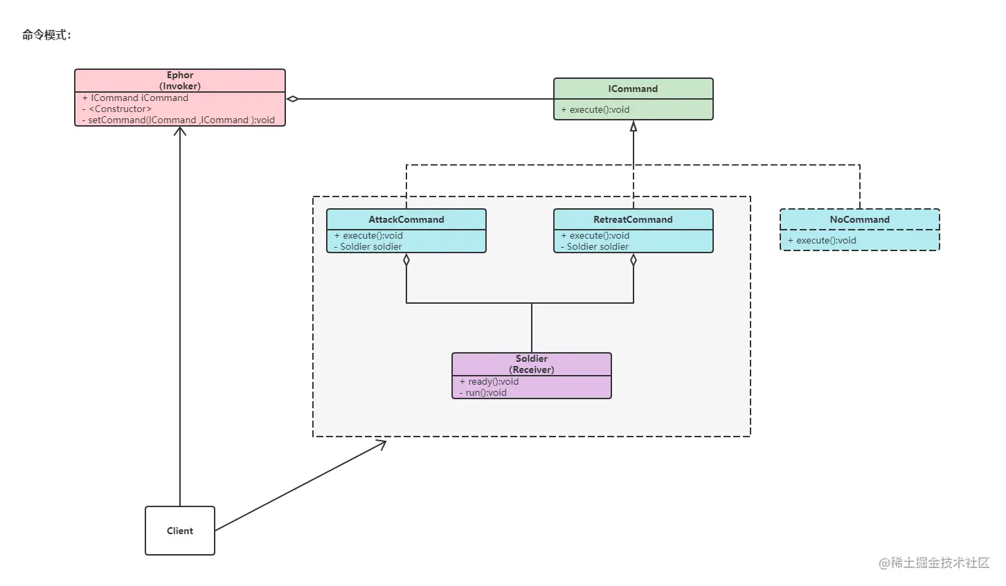 - 长官通过调用进攻和撤退命令,下达给士兵去执行,而士兵不用关心给我们下命令的长官是谁,只负责去执行。
