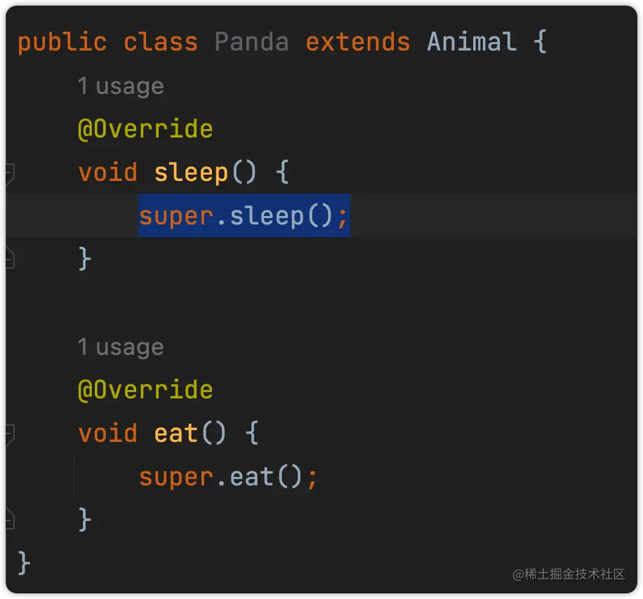 但是,这样直接覆写是很容易抄错的,比如eat()拼错了,那么其实覆写就失败了,但其实可能这样并不好发现