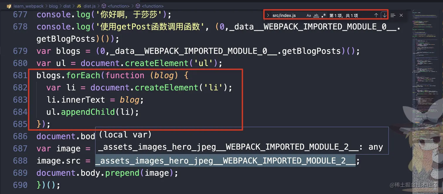 运行npx webpack打包后,在dist文件夹下的dist.js中,查找对应的代码结果如下: