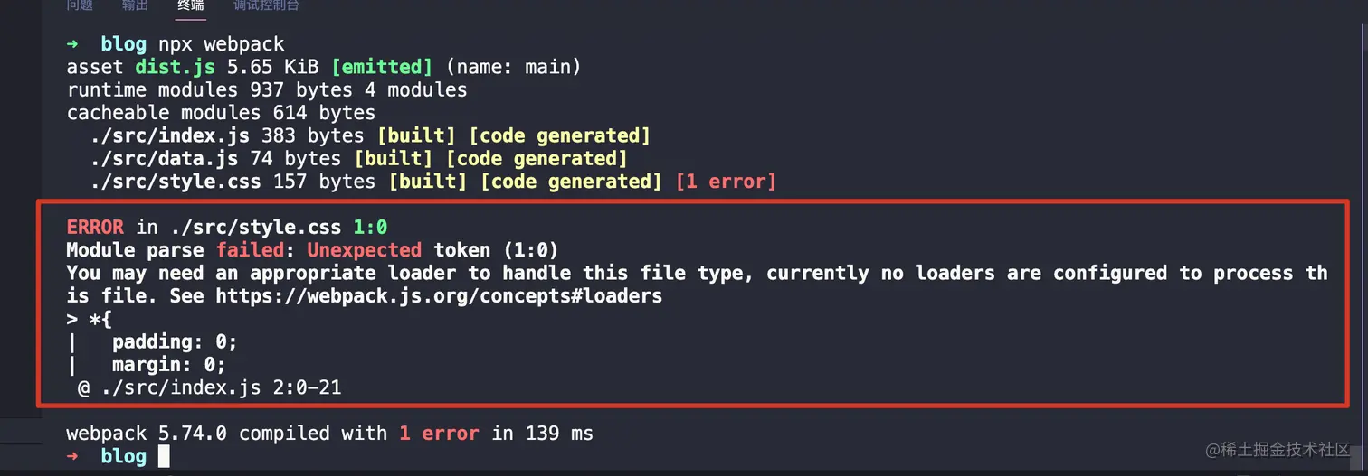 import './style.css';这里引入的css文件,运行后npx webpack后打包会出现下面的报错