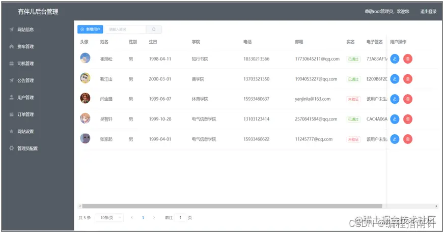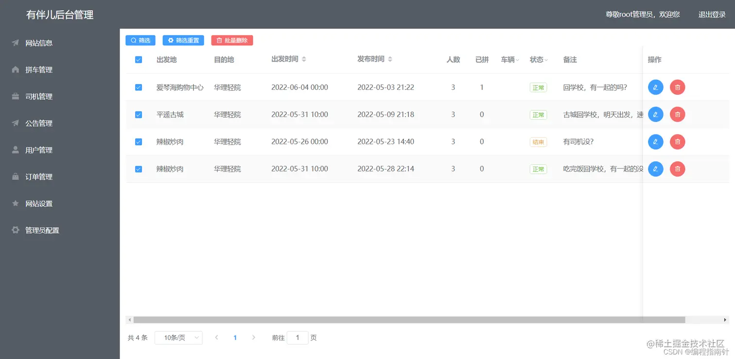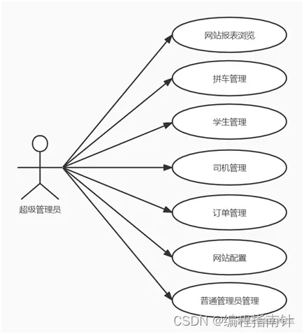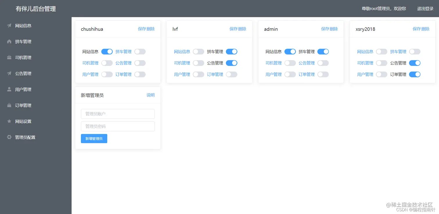 如图所示,超级管理员可以对拼车、学生、司机、订单、网站信息等进行管理,同时也可以新增普通管理员并赋予管理员权限。