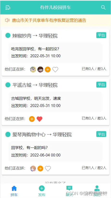 在开学与放假当中,越来越多的同学选择了拼车去火车站、公交车站等出行方式,虽然方便但是存在多种弊端,一是通过QQ空间或群聊天发布信息,查阅繁琐且无法获取乘车关键信息。二是存在安全隐患,无法确定发起人与乘坐人是否为校内同学,学校不能第一时间确定学生的出行状态,仅能依靠在线填表的方式进行统计。