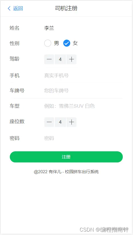 ⒁ 司机注册需要提供姓名、性别、手机号、驾龄、车牌号、汽车座位数,汽车型号等基本信息。完成注册后,需要向管理员提供驾照,身份证等证件核对,完成后即可登录。否则司机无法登陆系统。