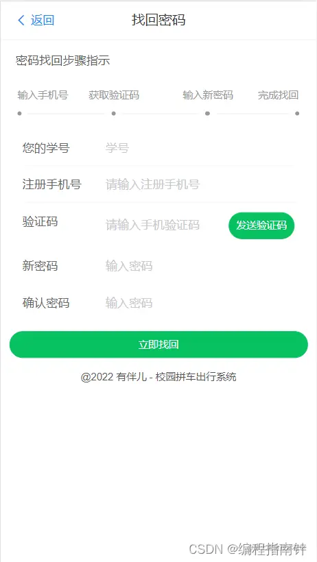 ⑵ 用户需要提供自己的的姓名(注册后不可更改)学号密码与真实手机号完成注册,同样在密码找回时,也需要提供手机号接收验证码完成密码找回。